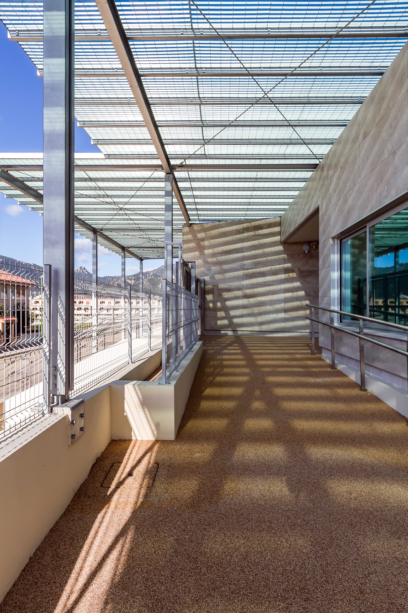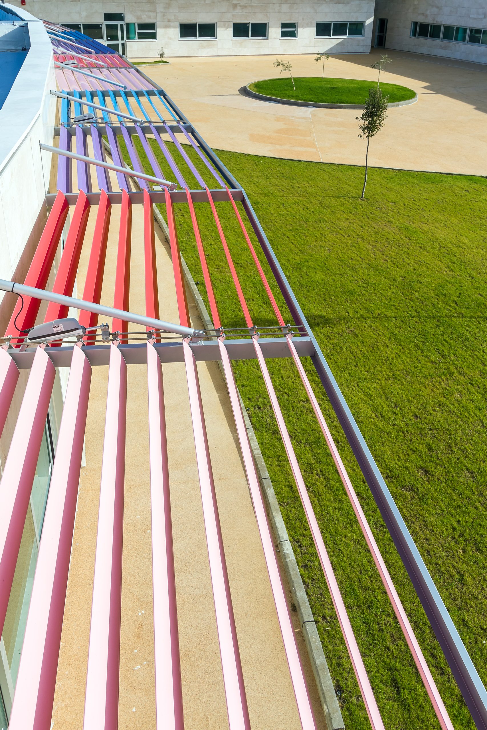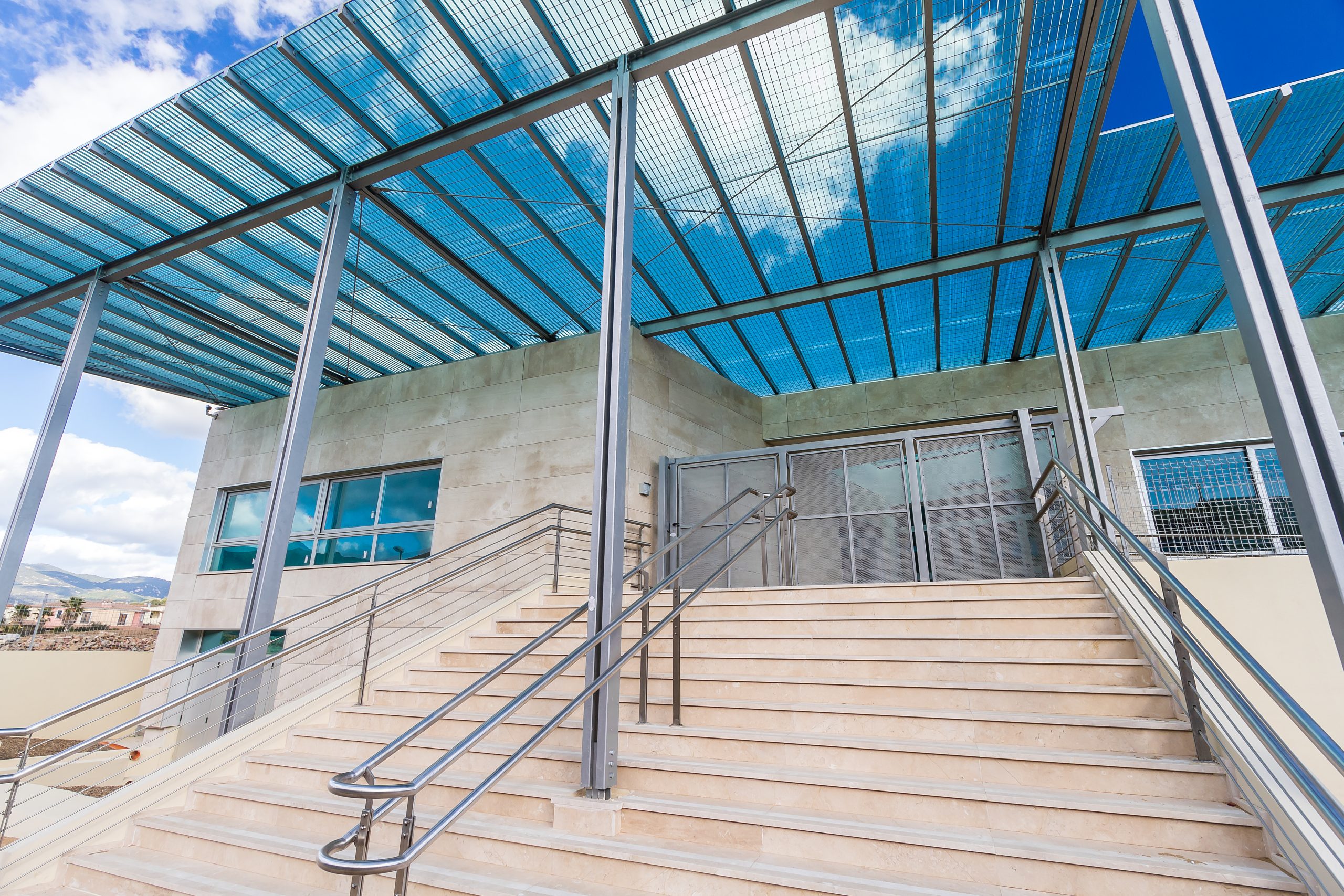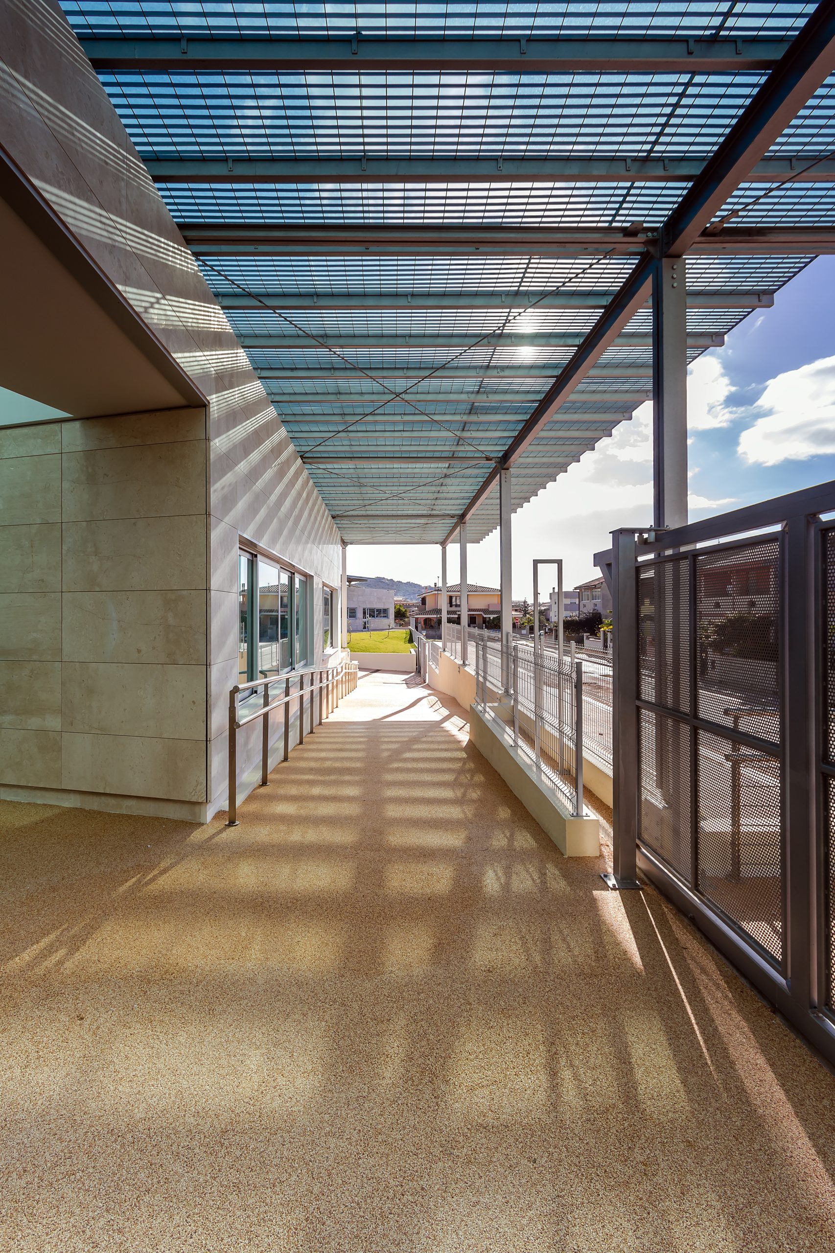 Il complesso scolastico è stato progettato prevedendo che le zone delle aule siano quelle più esposte all’influsso benefico dei raggi solari. Si è previsto nel contempo un sistema di pensiline e piastre di coperture atte a proteggere gli ambienti da fenomeni di abbagliamento e di surriscaldamento delle superfici esposte all’irraggiamento solare nei mesi estivi.