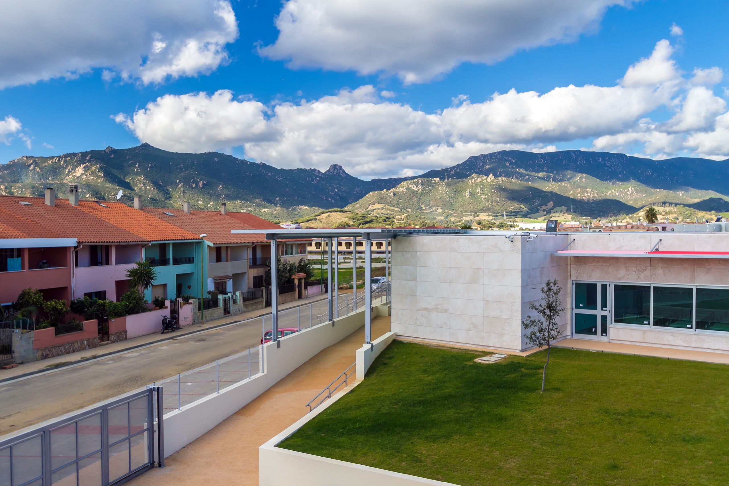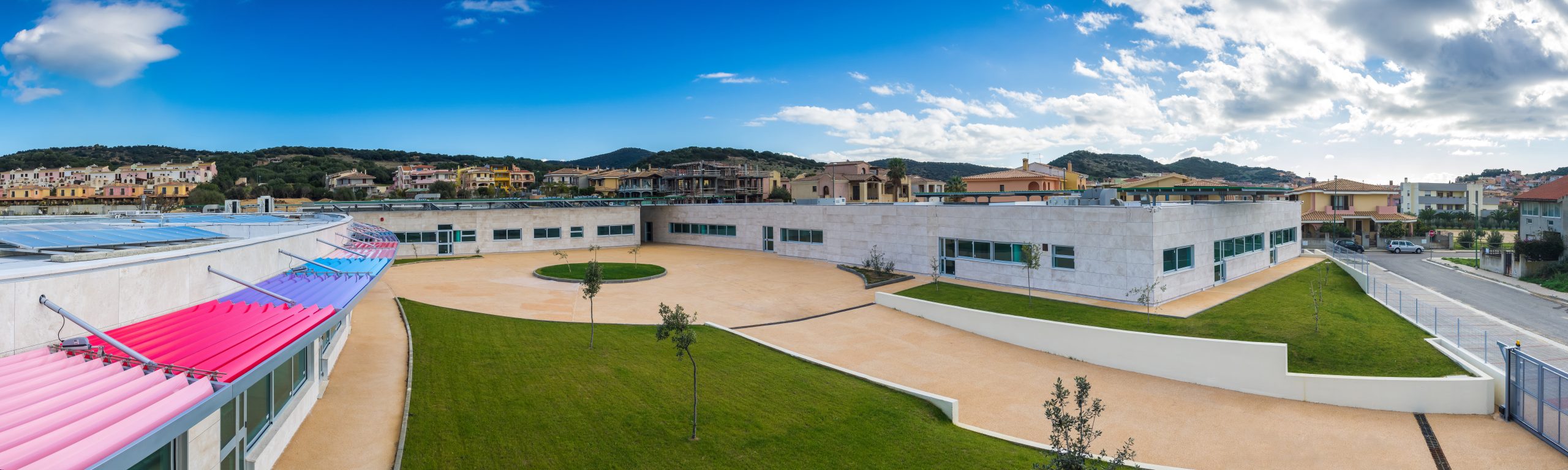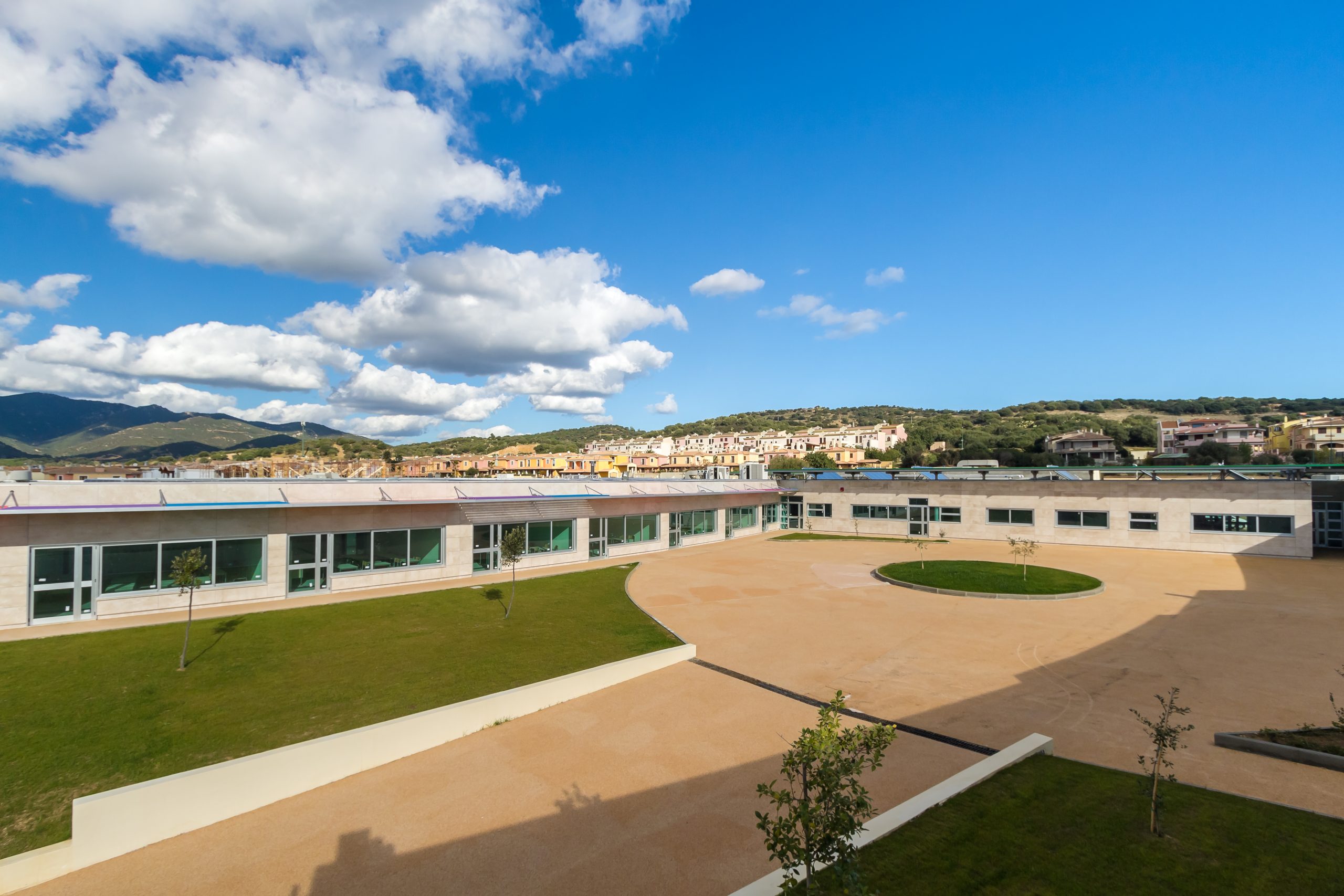 Tutto l’insieme dei servizi scolastici si articola attorno a due piazze: una prima che si affaccia direttamente sulla via Botticelli, una seconda che si affaccia sulla via Leonardo da Vinci, piazze concepite come accoglienza e compenetrazione degli spazi urbani del Comune di Villasimius all’interno dello spazio progettato.