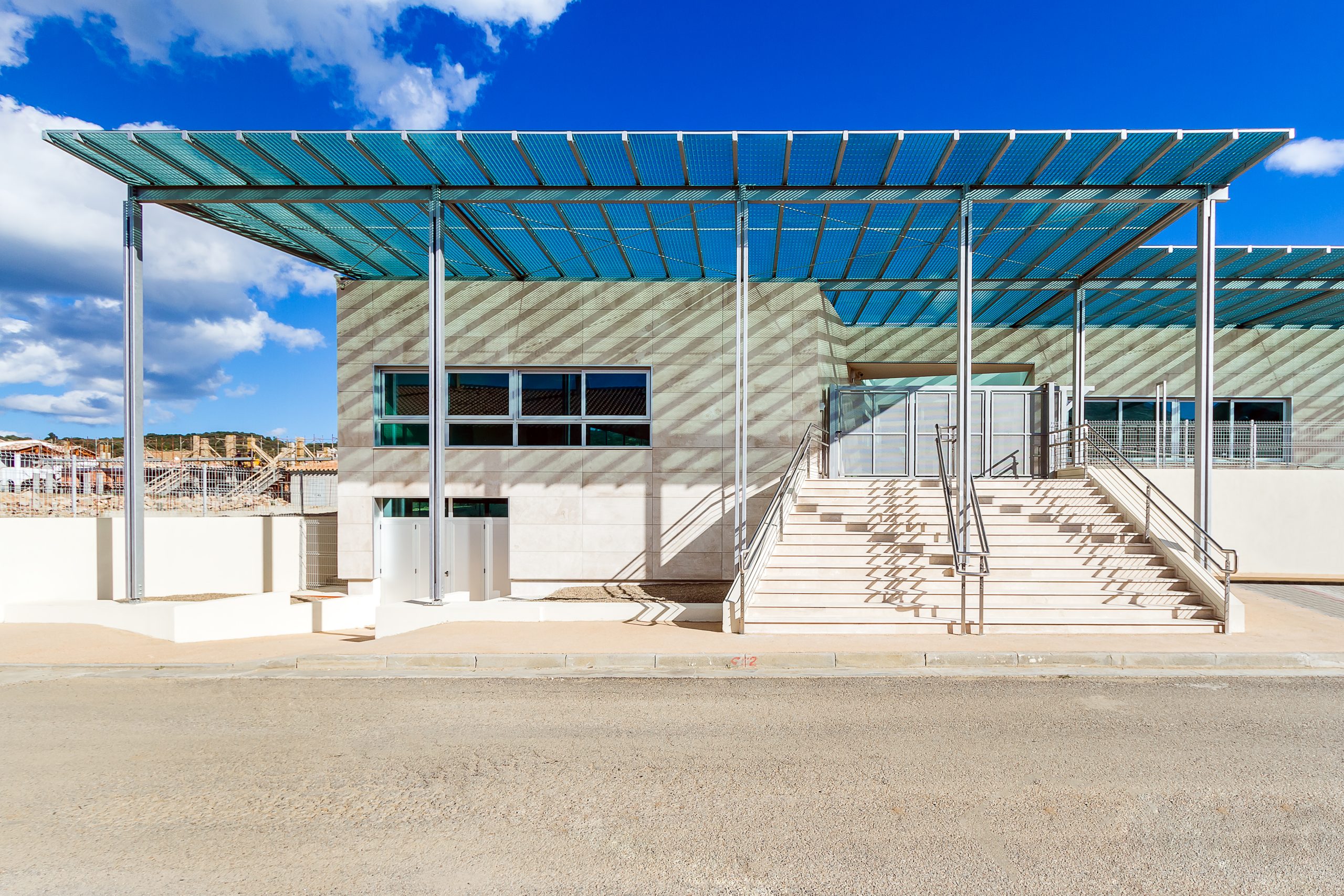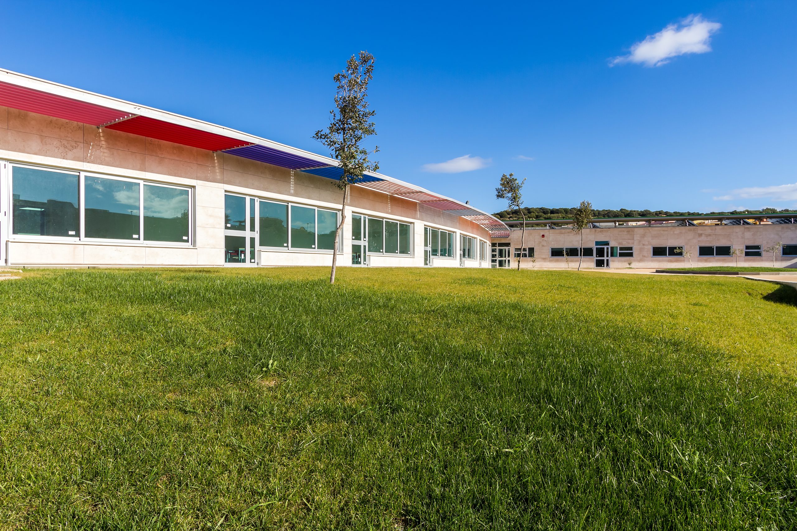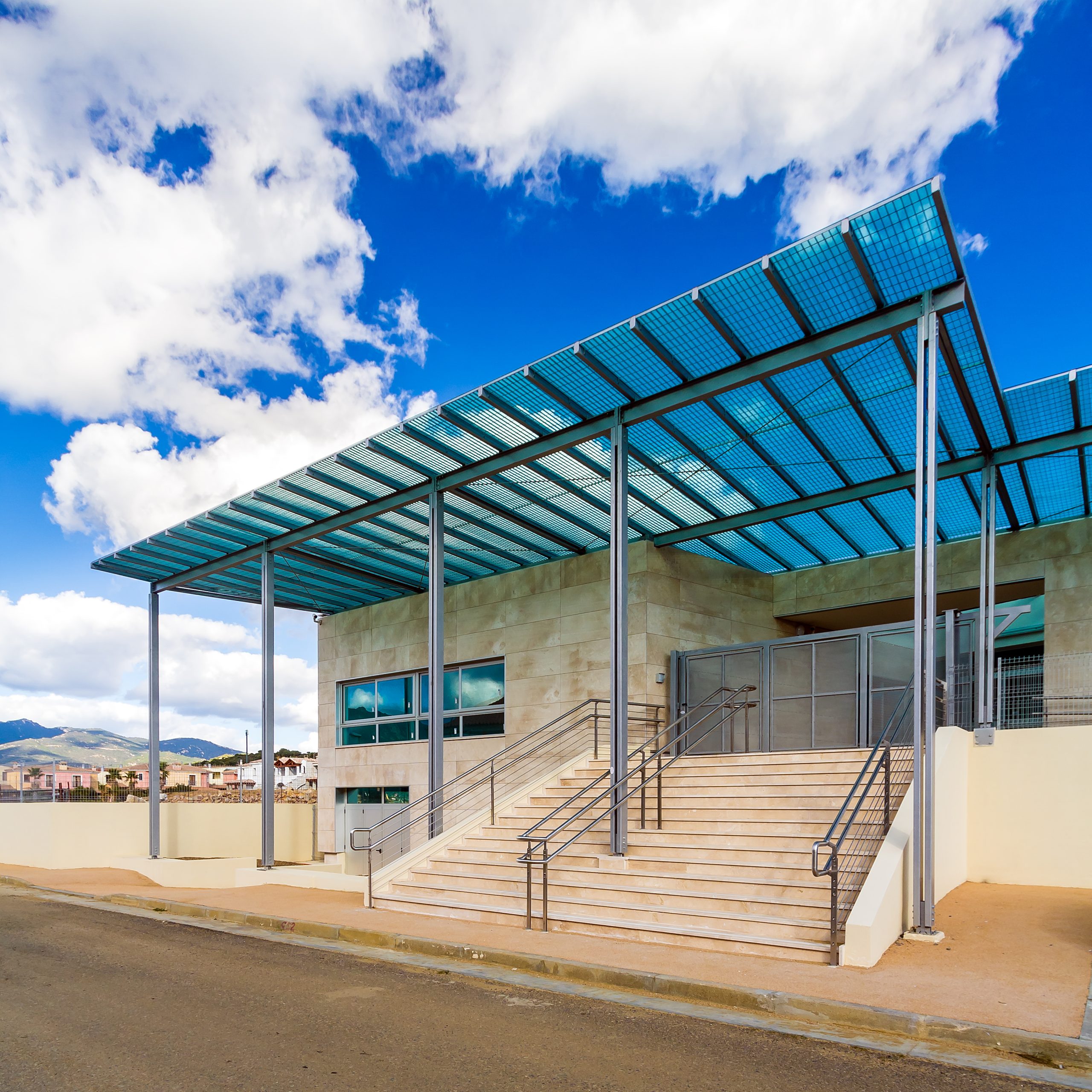 Tutto l’insieme dei servizi scolastici si articola attorno a due piazze: una prima che si affaccia direttamente sulla via Botticelli, una seconda che si affaccia sulla via Leonardo da Vinci, piazze concepite come accoglienza e compenetrazione degli spazi urbani del Comune di Villasimius all’interno dello spazio progettato.