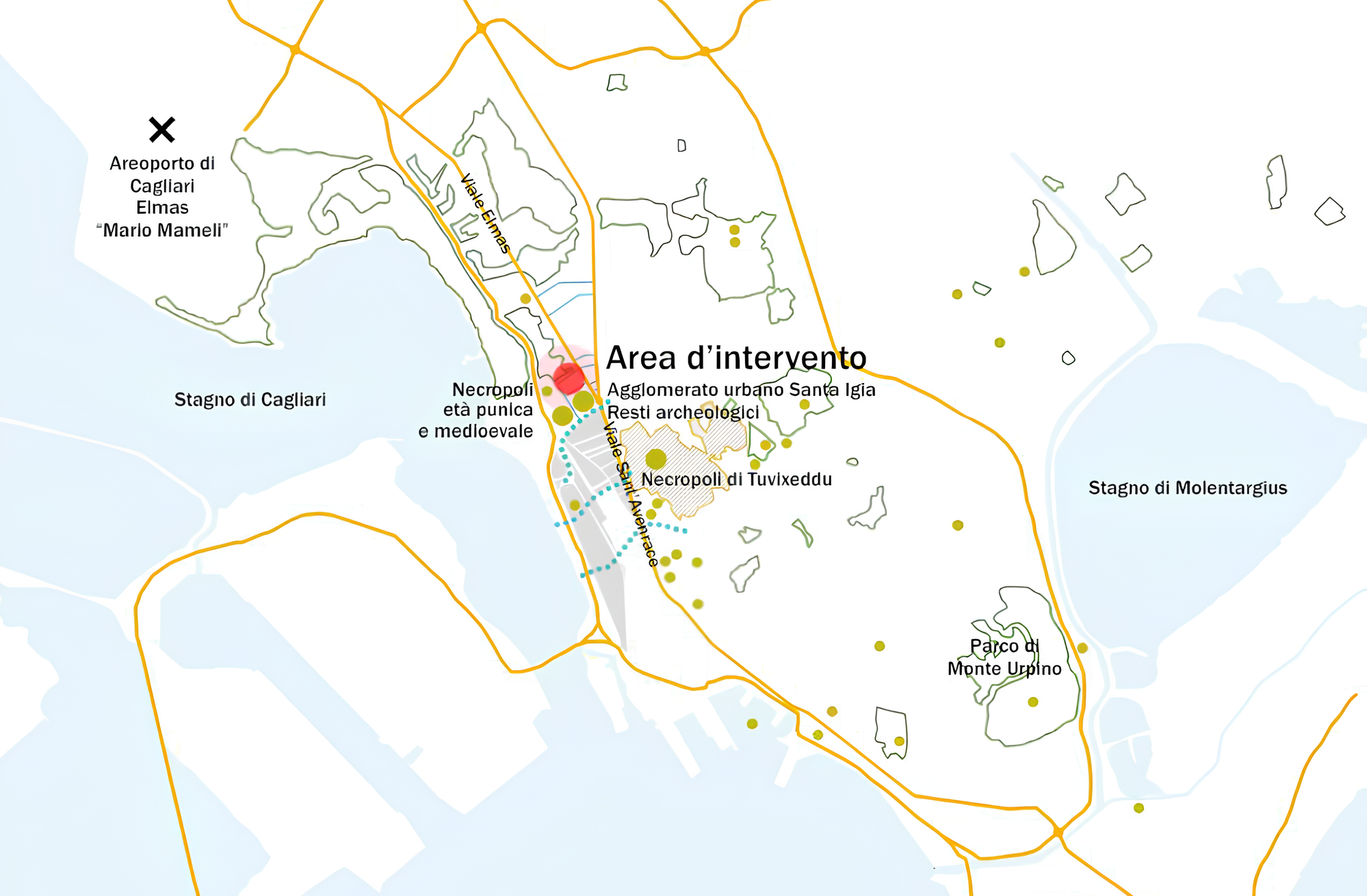 L’area oggetto dell’intervento si pone a margine tra il tessuto urbanizzato ed un’ampia area incolta. E’ caratterizzata dalla compresenza di tessuto residenziale e di aree a destinazione terziario/commerciale di media e grande distribuzione. In considerazione della sua posizione è stata rilevata la carenza di spazi collettivi e servizi di intrattenimento. L’area è rilevante soprattutto dal punto di vista archeologico – paesaggistico sia per i ritrovamenti archeologici che per la vicinanza alla Laguna di Santa Gilla.