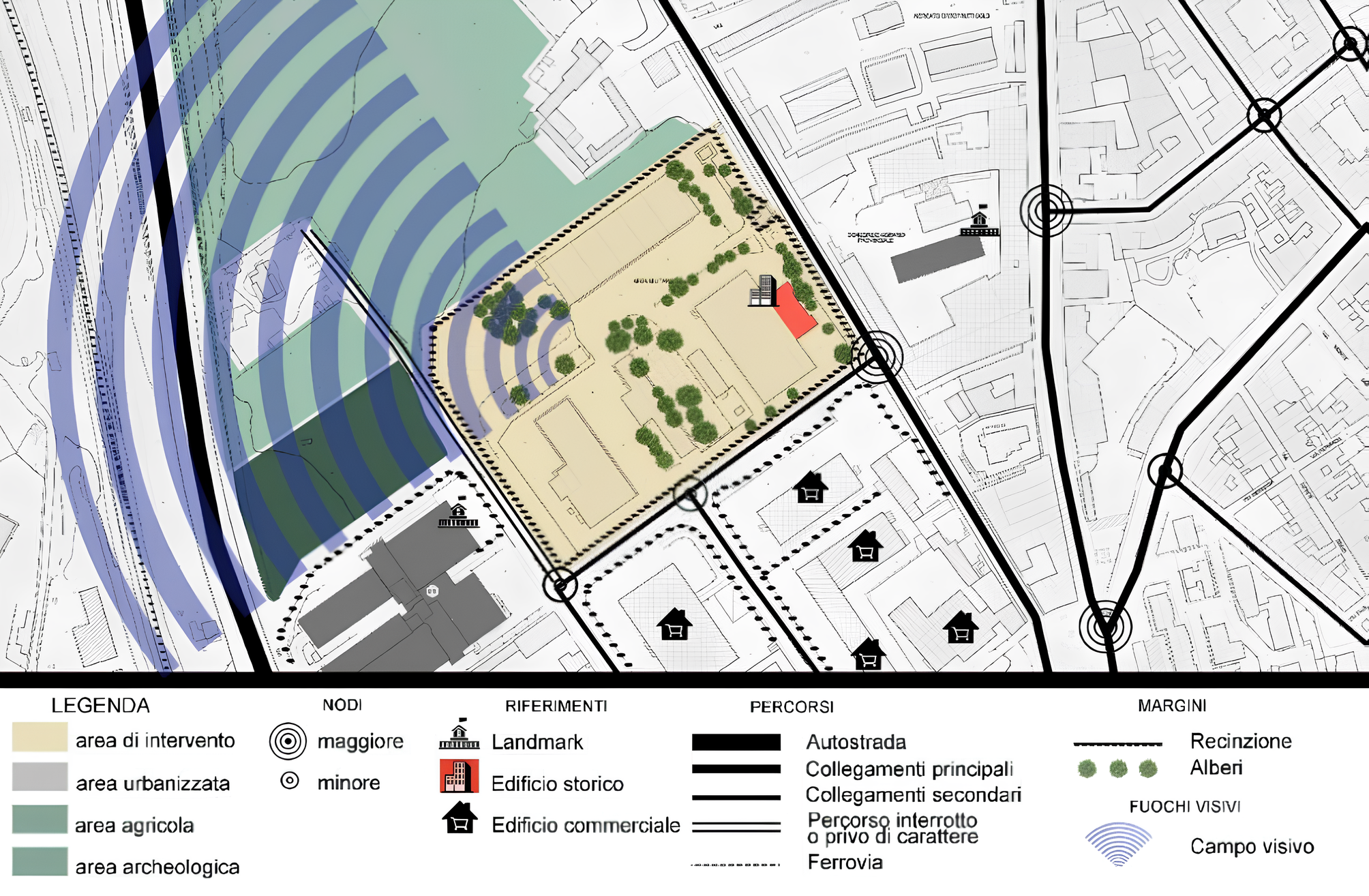 In Generale l’impostazione progettuale tiene conto del rapporto con il tessuto urbano ed edilizio circostante, in termini di riconoscibilità ed identità urbana, visibilità, integrazione e sicurezza, anche al fine di qualificare l’intervento dal punto di vista architettonico, con particolare attenzione alle relazioni con il paesaggio aperto e urbano e al rapporto con le preesistenze storico/archeologiche e delle architetture moderne presenti nell’area.