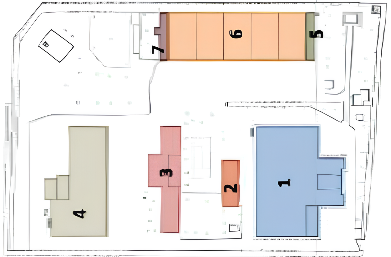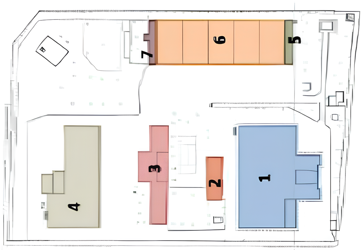 All’interno dell’area, insistono sette corpi di fabbrica principali, alcuni manufatti accessori e locali tecnici ascrivibili a fasi costruttive differenti, la prima delle quali risalente agli anni Quaranta del Novecento. Si tratta di edifici con caratteristiche morfologiche e costruttive diverse, che hanno subito notevoli rimaneggiamenti nel corso del tempo.