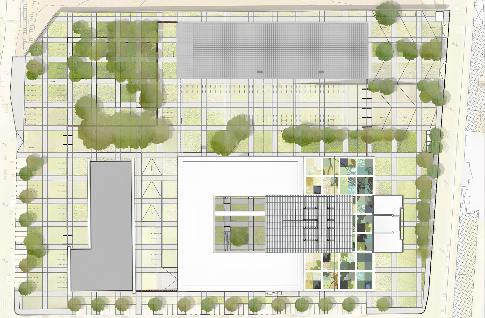 Partendo da queste considerazioni la generazione dello spazio esterno parte dalla volontà di salvaguardare i possibili resti archeologici presenti nel sottosuolo; il concept del disegno richiama la maglia preparatoria usata per le indagini archeologiche. Il progetto dello spazio pubblico è contraddistinto da percorsi e accessi costituti da una maglia regolare che poggia sul terreno e permette il flusso veicolare. Le pendenze e raccolta delle acque superficiali sfruttano le pendenze naturali esistenti. Le aree verdi e la vegetazione il cui progetto prevede il mantenimento delle specie arboree esistenti e il potenziamento di alcuni sistemi arborei e arbustivi già presenti.