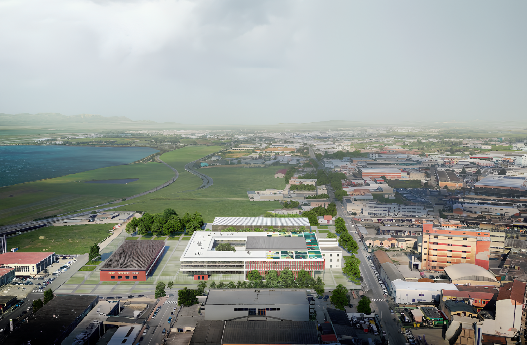 L’idea di progetto, a partire da un giudizio di valore sull’attuale contesto, guarda ad un paesaggio più ampio: legge le confluenze, le contraddizioni, la geografia, per assegnare al progetto un ruolo di “nuova centralità” nel sistema urbano. Al fine di perseguire tale scopo le recinzioni vengono poste in prossimità degli edifici così da conformare uno spazio di piazza fruibile dai cittadini anche nelle ore notturne. Gli spazi pubblici che si vengono a formare sono multifunzionali ossia oltre la funzione di piazza e sono da considerarsi anche zone a verde e parcheggio.