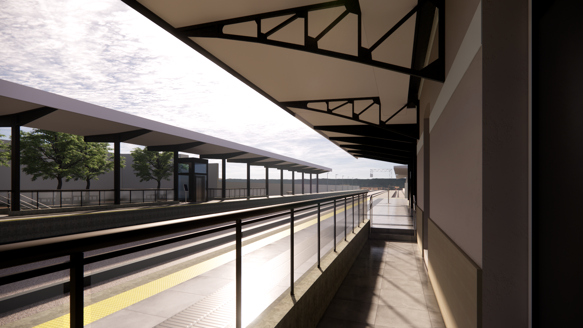 Lo spazio ricompreso tra il fabbricato viaggiatori e il fabbricato privato non oggetto di intervento ospiterà una area coperta adibita al parcheggio bici. Gli stalli saranno distribuiti su 2 file da 7 posti ciascuno ortogonalmente ai muri dei fabbricati. L’area, in quota con il marciapiede esterno, conduce poi comodamente alla quota +55 attraverso una rampa. La pensilina sarà adiacente alla copertura dei fabbricati adiacenti e sarà raccordata mediante una scossalina metallica.
