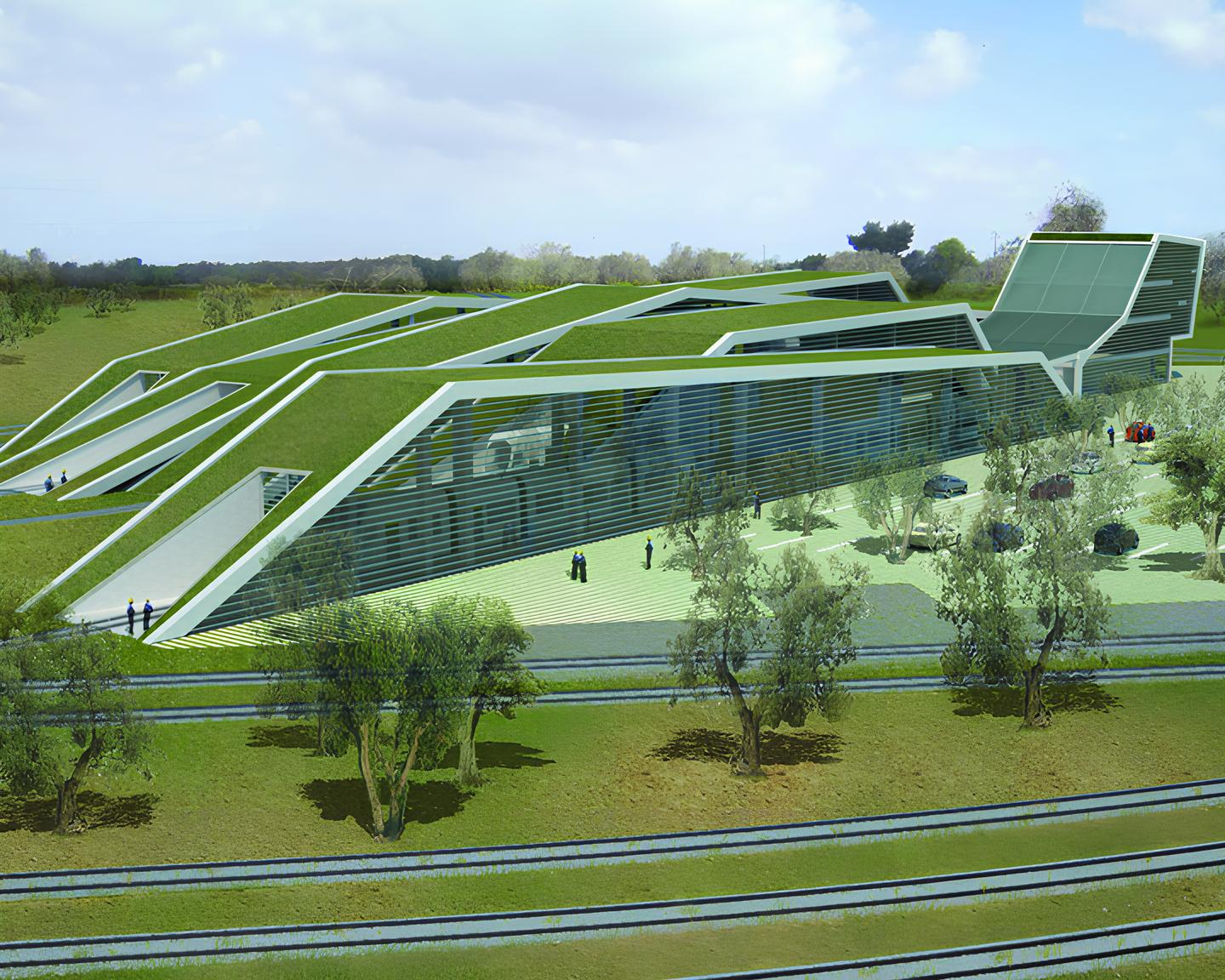 L’edificio è concepito come un elemento integrato nella topografia dell’area; i cinque padiglioni ridisegnano il profilo collinare della zona. La topografia complessa del parco di copertura è come ritagliata, infatti, in strisce longitudinali in cui le diverse altezze garantiscono l’illuminazione e l’areazione naturale.