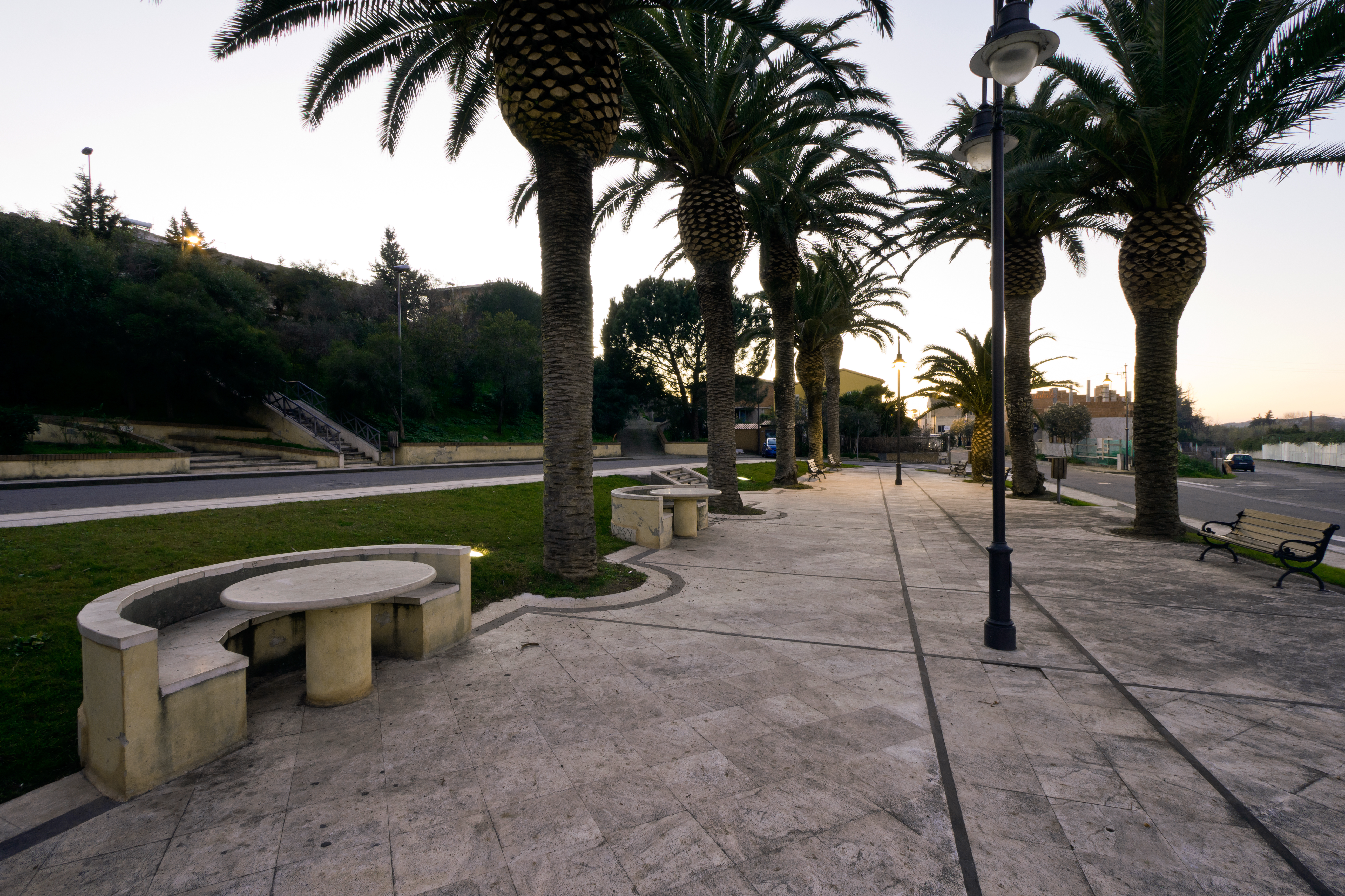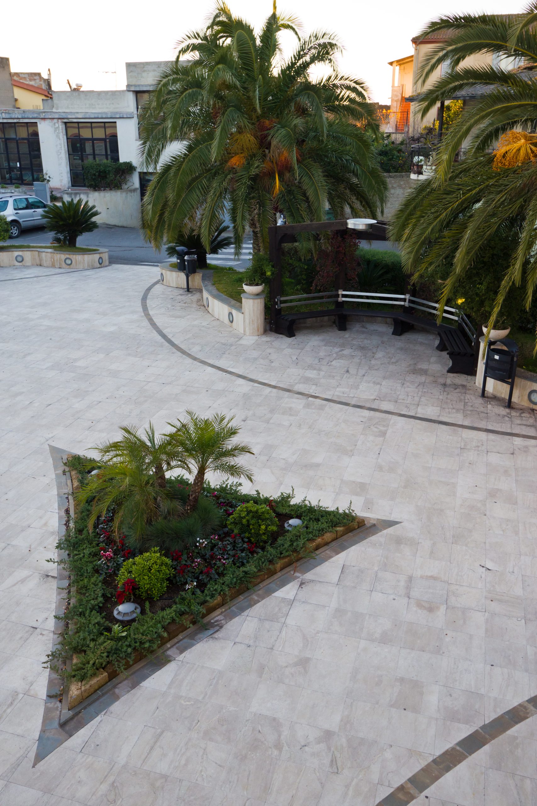 La pavimentazione è realizzata in marmo, con cordoli e cornici di colore scuro in basalto, disponendo elementi di diverse dimensioni in diverse tessiture. Sono state collocate due panchine con tavolo, di forma semicircolare, in muratura con piano di seduta in pietra, altre otto panchine sono in legno. E’ stata pure realizzata una fontana posizionata in corrispondenza della rampa d’accesso: di pianta circolare, costituita da blocchi in pietra bianca a sezione trapezoidale.