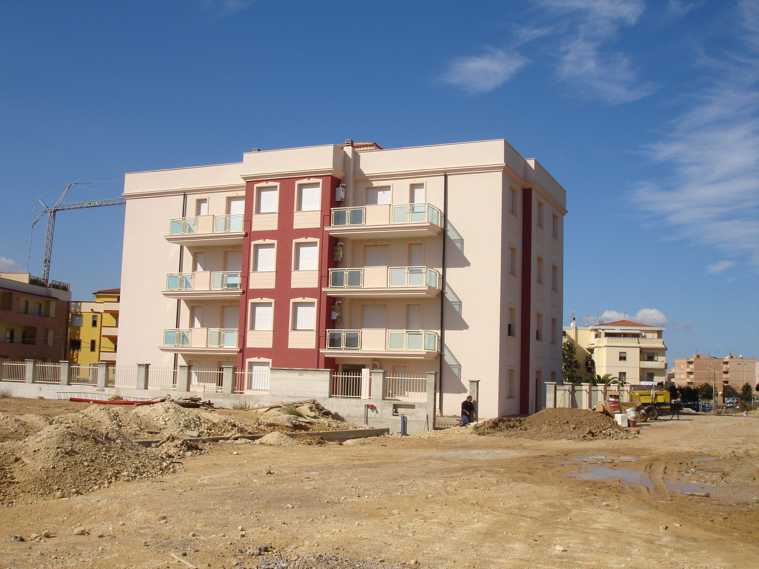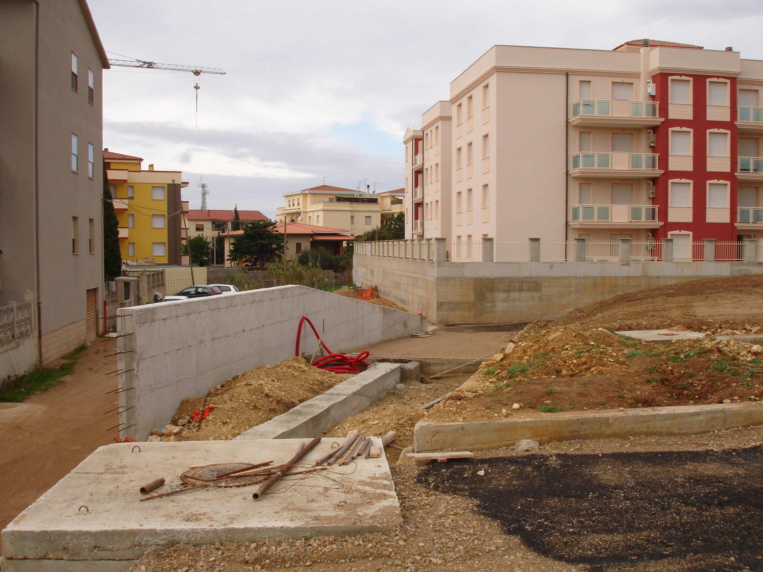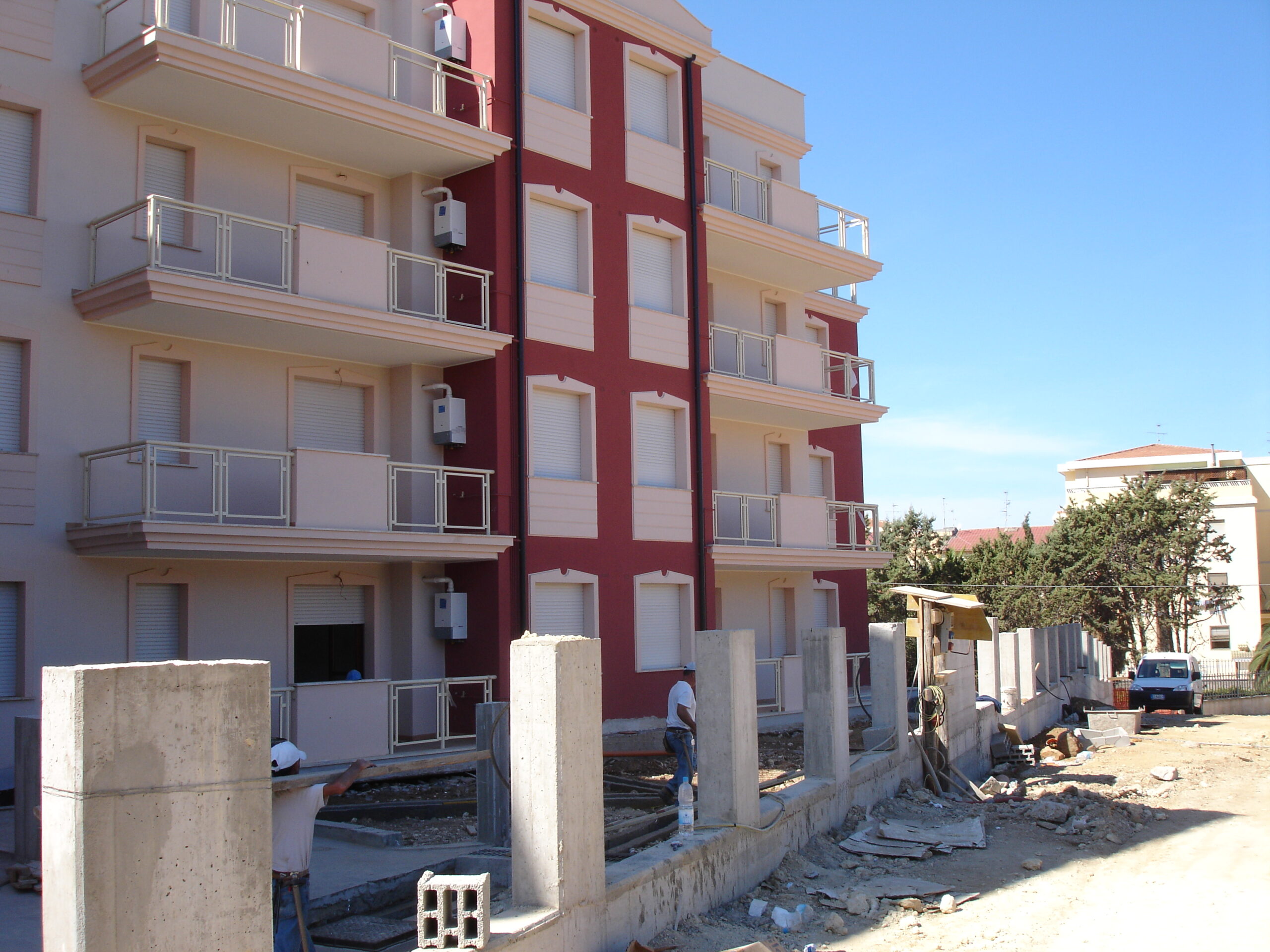 Le opere da eseguire consistono nell’esecuzione degli scavi di fondazione fino alla profondità di circa mt. 2,50 sotto il piano di campagna, il getto in calcestruzzo per il riempimento delle fondazioni e la formazione di muri di contrasto in calcestruzzo armato, la formazione di pilastri, esecuzione di murature in elementi laterizi fino all’altezza di mt. 3,50 circa per il piano terra e mt 2,70 per ogni piano alto, il posizionamento e l’esecuzione dei solai di calpestio e copertura realizzati in travetti e pignatte laterizie h 20/30 cm, intonaci in malta bastarda e lavori di rifinitura, tinteggiature, pluviali, etc.