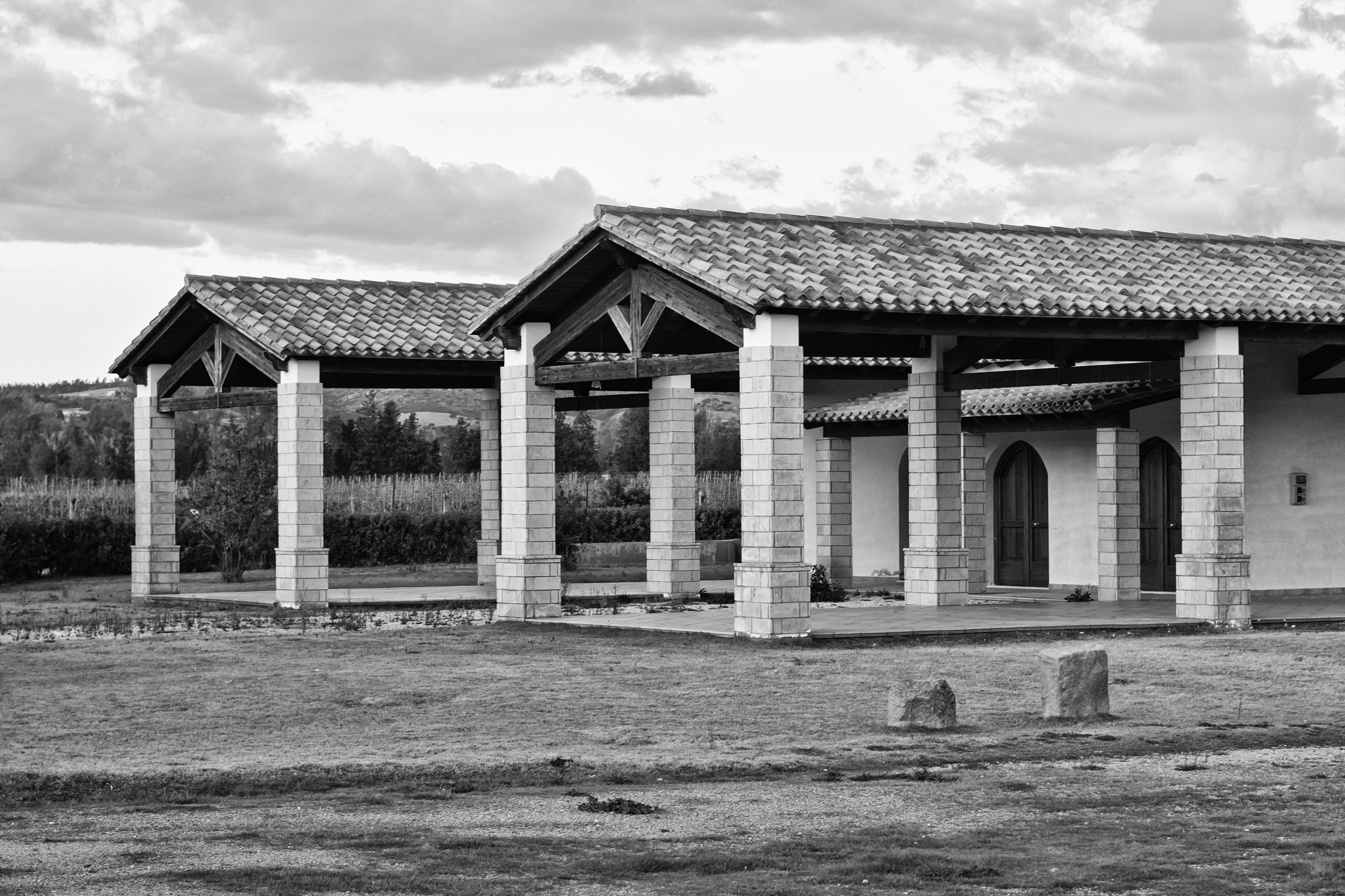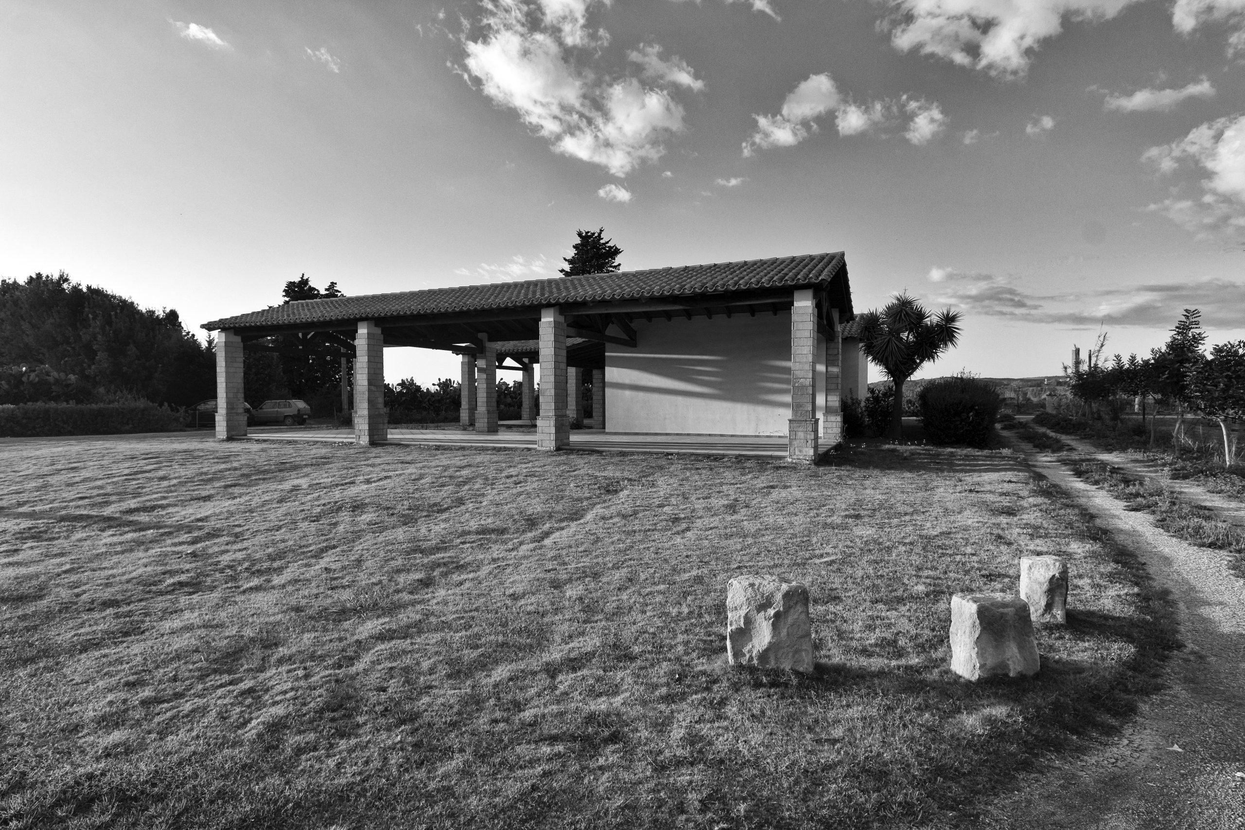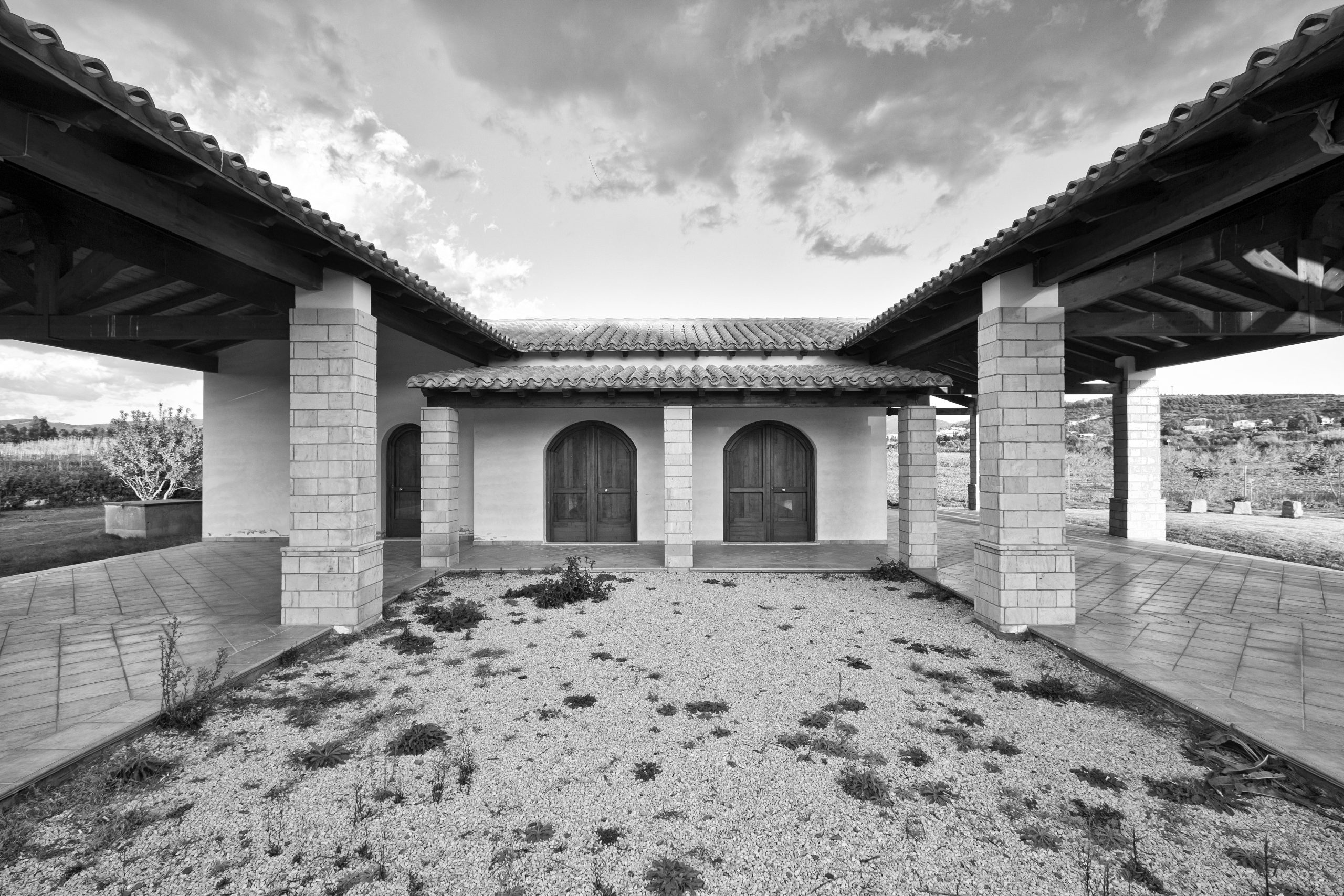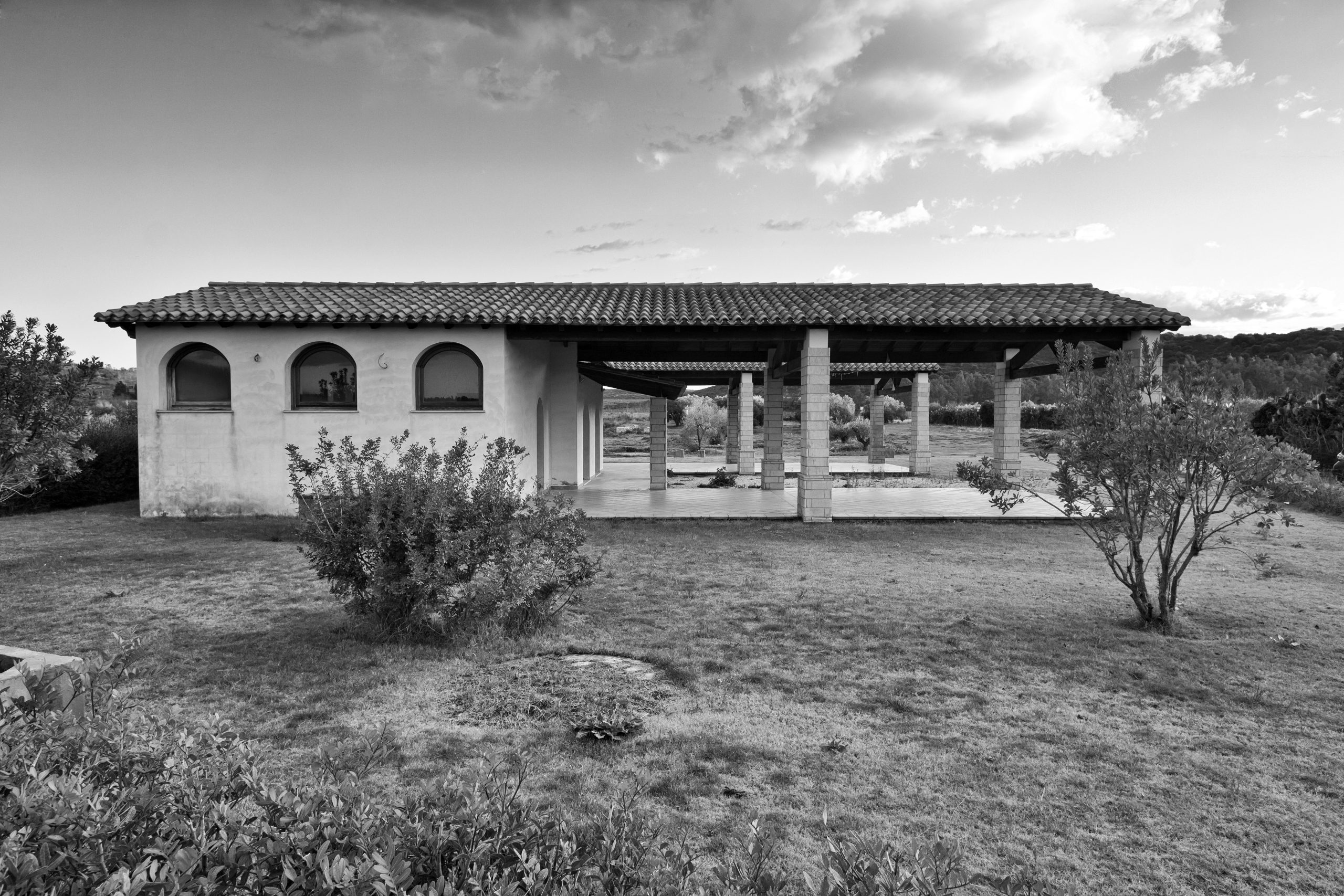 Oltre alla sistemazione a verde attrezzato di una parte dell’area antistante l’ingresso alla chiesa, è prevista dunque la realizzazione di un edificio servizi il cui accesso principale è raggiungibile da un camminamento in asse con il vialetto della chiesa. Al suo interno si trovano una sala polivalente, un blocco di servizi igienici per il pubblico e un ampio porticato con corte interna. L’edificio è realizzato con materiali e tipologie architettoniche affini a quelli della chiesa, sulla base delle tecniche costruttive locali. Sono presenti riferimenti alla tipica casa corte, presente nel paese di Donori, con delle varianti che la rendono funzionale al tipo di attività che l’edificio ospita.