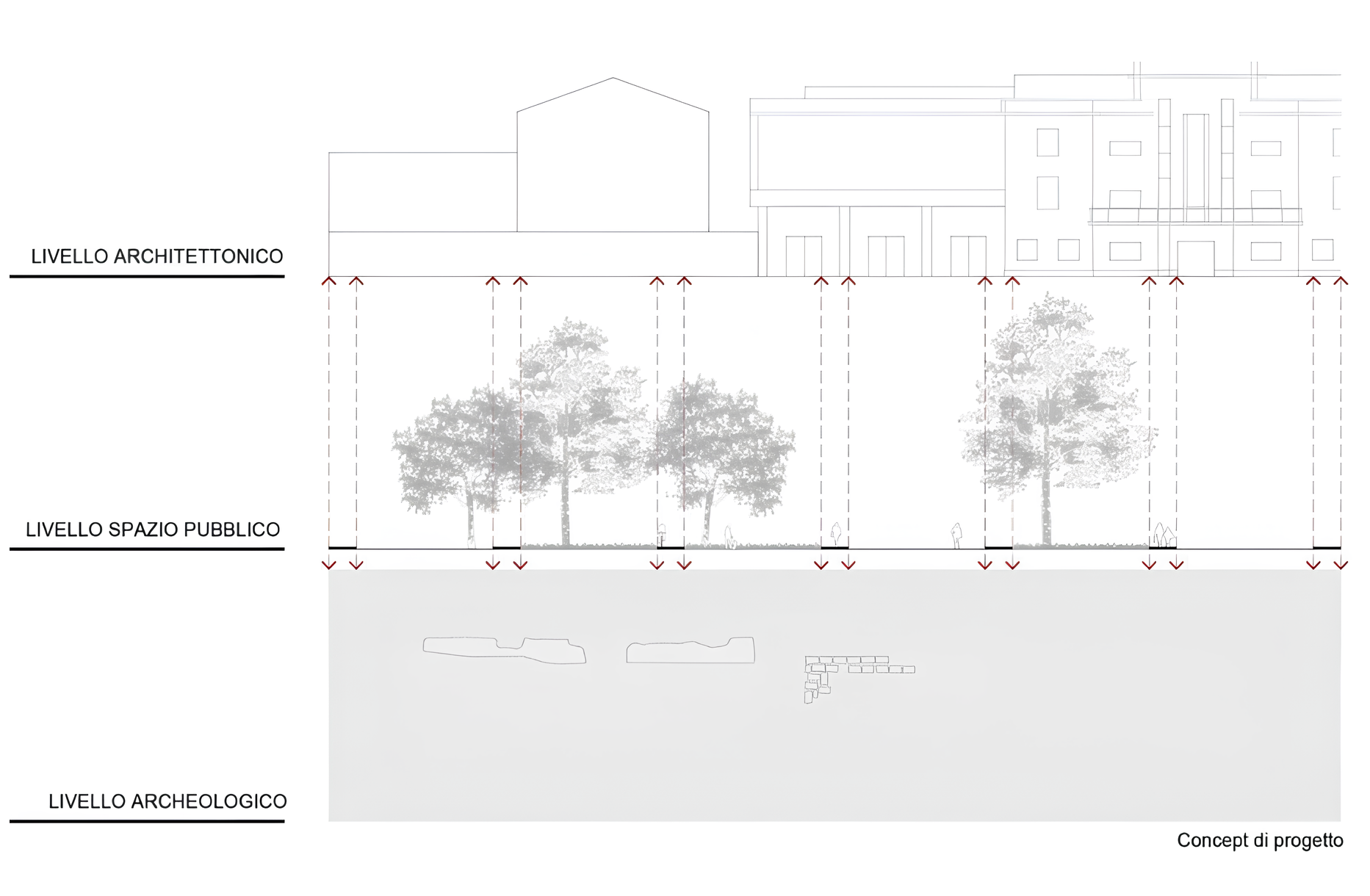 Il progetto paesaggio va a pari passo con il progetto architettonico e si fonda sulla valorizzazione del territorio e delle sue peculiarità come la presenza di edifici di valenza storica-culturale e le presenze archeologiche nel sottosuolo. SI è scelto di sfruttare questa stratificazione per concepire l’area su tre differenti livelli: uno ipogeo, dei resti archeologici; uno in alzato, degli edifici oggetto di intervento e la loro rifunzionalizzazione; e uno intermedio, sul quale agisce il progetto di paesaggio e che si apre ad una possibile esplorazione dello spazio in maniera verticale (dall’alto al basso) oltre che, in quanto passaggio privato e in parte pubblico, alla sua naturale vocazione di “attraversabilità” orizzontale.
