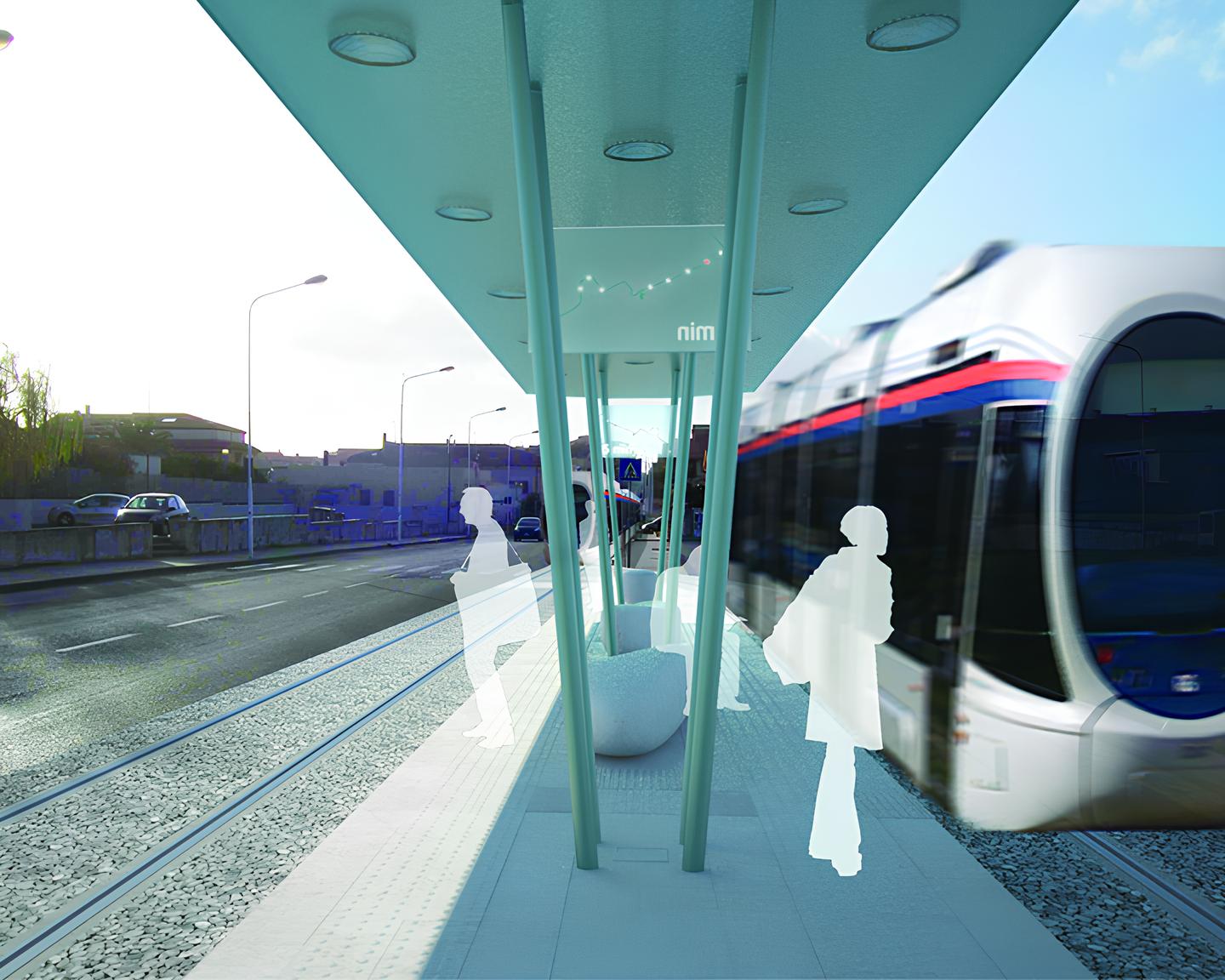 Quest’ultima è anch’essa in acciaio, rivestita con pannelli in vetro stratificato antisfondamento e con possibilità di installazione, nell’estradosso, di pannelli fotovoltaici in silicio policristallino per l’alimentazione di luci a led. In ogni fermata sono previste panchine per la sosta con scocca in vetroresina rivestita in pasta di marmo “MARMORINO”.