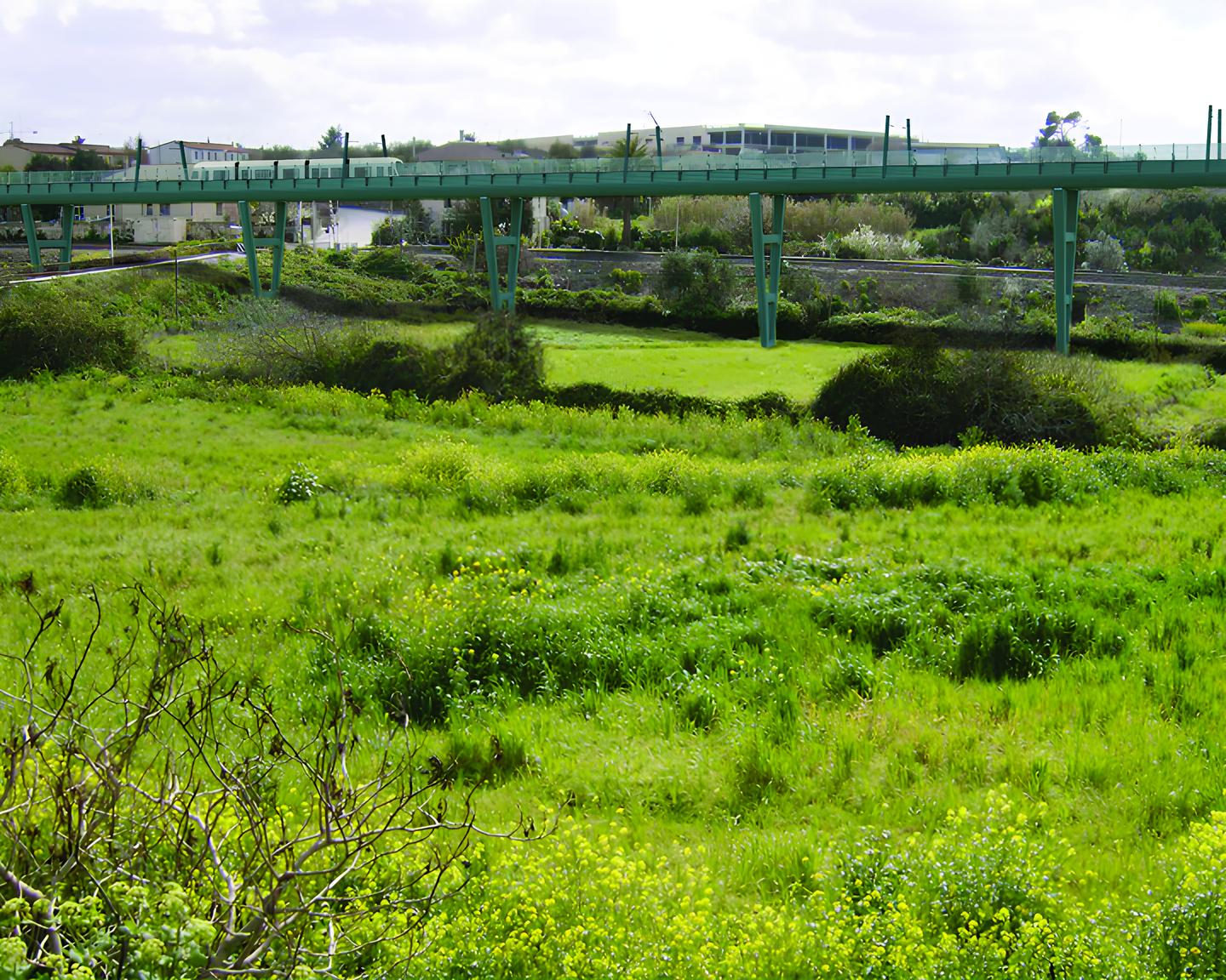 Si sviluppa per circa 600 metri, necessario per sovrapassare la linea della Ferrovie dello Stato e la Strada Statale 131. Costituito da campate di 30 metri di luce (che si riducono nei tratti in curva), il viadotto insiste in un’area a carattere agricolo. Nella progettazione della struttura sono state scelte tecnologie che permettono di ridurre alle dimensioni minime possibili l’altezza complessiva e gli ingombri.