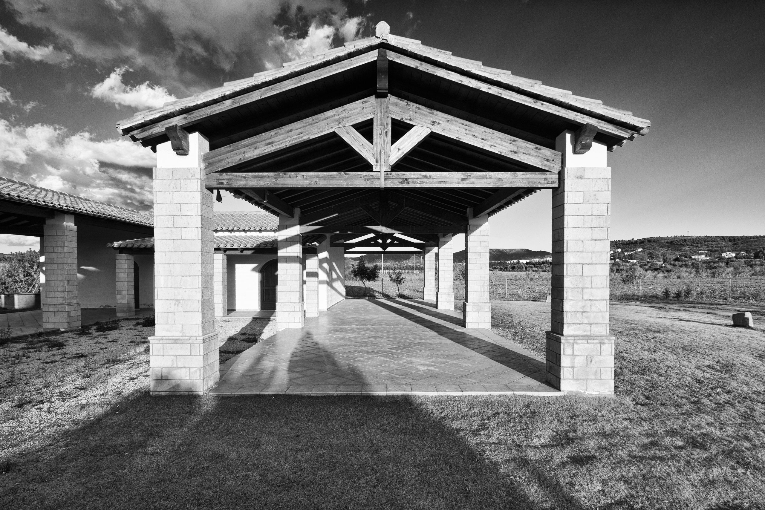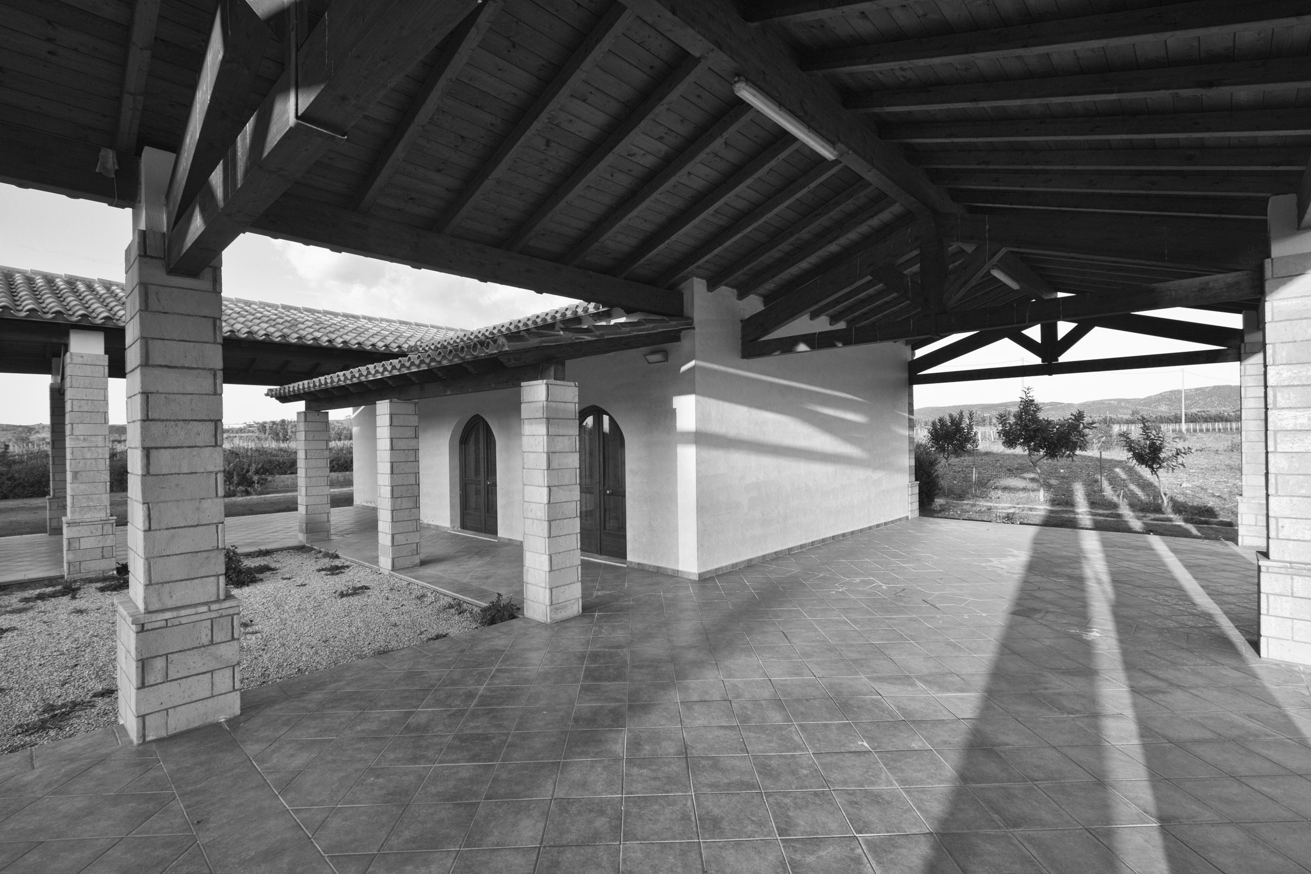 Oltre alla sistemazione a verde attrezzato di una parte dell’area antistante l’ingresso alla chiesa, è prevista dunque la realizzazione di un edificio servizi il cui accesso principale è raggiungibile da un camminamento in asse con il vialetto della chiesa. Al suo interno si trovano una sala polivalente, un blocco di servizi igienici per il pubblico e un ampio porticato con corte interna. L’edificio è realizzato con materiali e tipologie architettoniche affini a quelli della chiesa, sulla base delle tecniche costruttive locali. Sono presenti riferimenti alla tipica casa corte, presente nel paese di Donori, con delle varianti che la rendono funzionale al tipo di attività che l’edificio ospita.